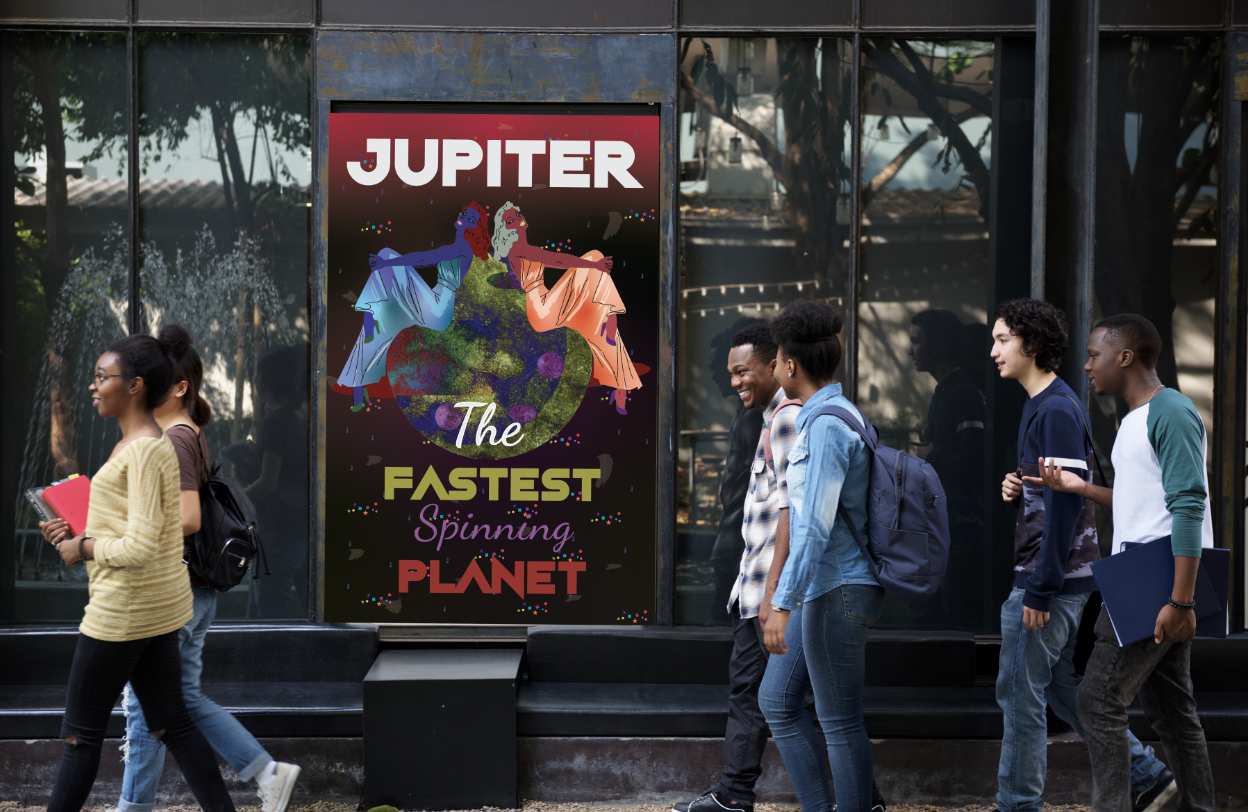 This was created for a science fiction project prompt of space travel tourism. My planet was Jupiter, the fastest spinning planet in the solar system. Indulging my love of science fiction, I added some alien women.